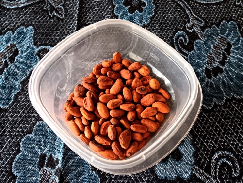 Back to the nuts: it wasn’t until a couple weeks later that I bought a bag and took it home. Crunching into one, I realized they were raw and needed to be roasted. And wow, were they bitter! I never knew raw almonds could be so bitter. Putting a stainless steel pan on a burner, I stirred some up for about thirty minutes until they were a nice and toasty dark brown.